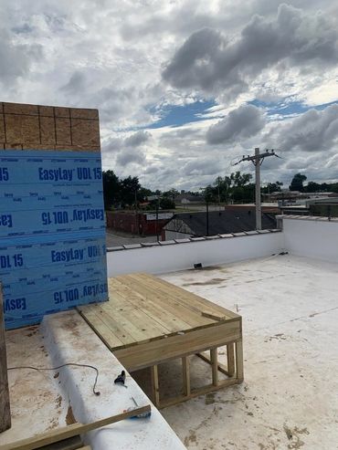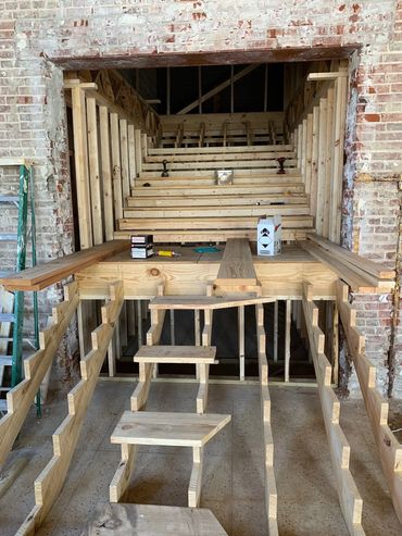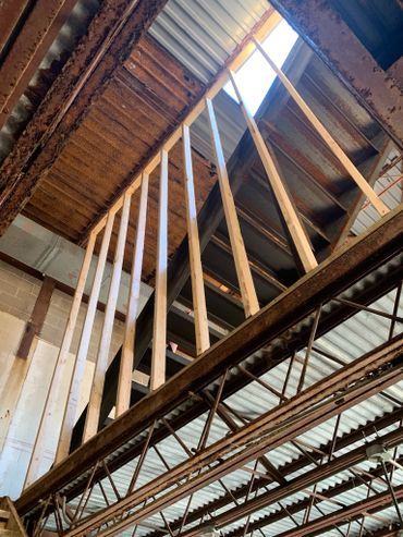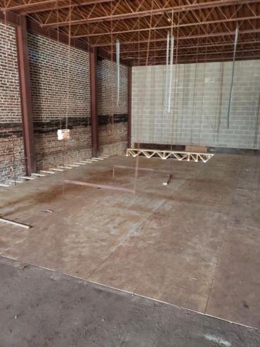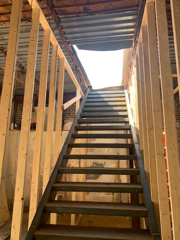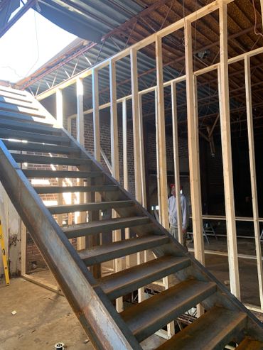 Work continues on The Exchange, framing out walls and removing prior drop ceiling wires. This staircase leads up to a 4,500 square foot rooftop deck!